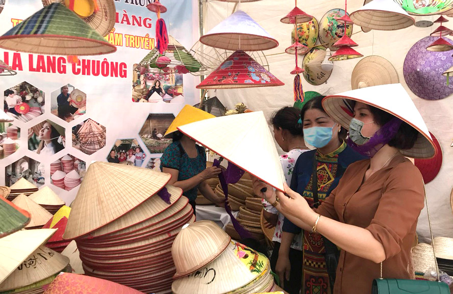 Du khách lựa chọn sản phẩm nón làng Chuông, xã Phương Trung (huyện Thanh Oai), tháng 3-2021.