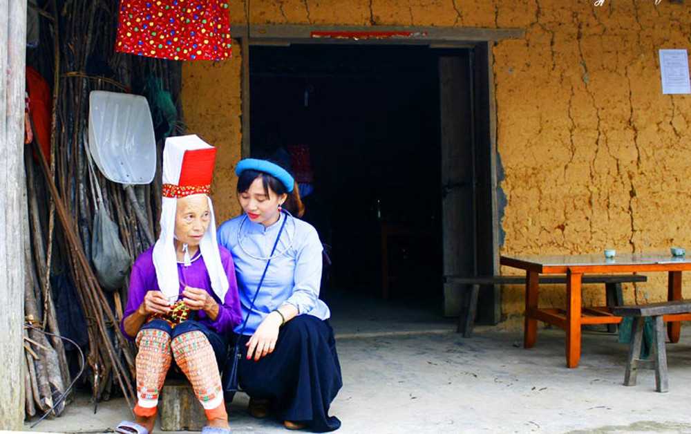 Bà con ngồi thêu trang phục truyền thống trước cửa nhà là hình ảnh thường thấy khi du khách ghé thăm nếp nhà của người Dao ở Sông Moóc.