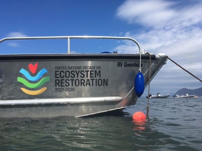 Một con tàu đang trồng cỏ biển dọc theo bờ biển xứ Wales, Vương quốc Anh. (Ảnh: Dự án Seagrass)