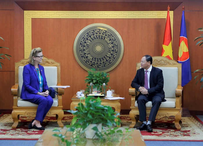 Thứ trưởng Bộ TNMT Lê Minh Ngân trao đổi với bà Caitlin Wiesen, Trưởng đại diện thường trú Chương trình Phát triển của Liên Hợp Quốc (UNDP) tại Việt Nam về việc tổ chức Hội nghị quố tế về kinh tế đại dương bền vững và thích ứng với biến đổi khí hậu