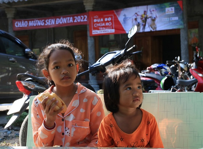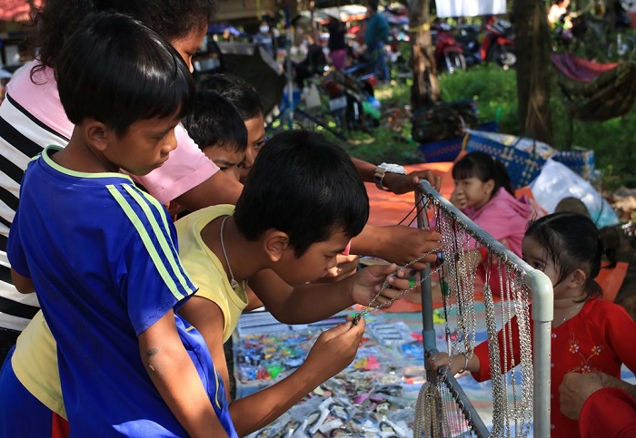 Trẻ con đồng bào dân tộc thiểu số Khmer háo hức rủ nhau “đi hội”, để được ăn món này, mua món kia, nhìn ngó không gian đặc quánh người. Với tụi nhỏ vùng biên hẻo lánh này, cái gì cũng mới lạ, cũng đầy thu hút, đâu dễ gặp được thường xuyên.