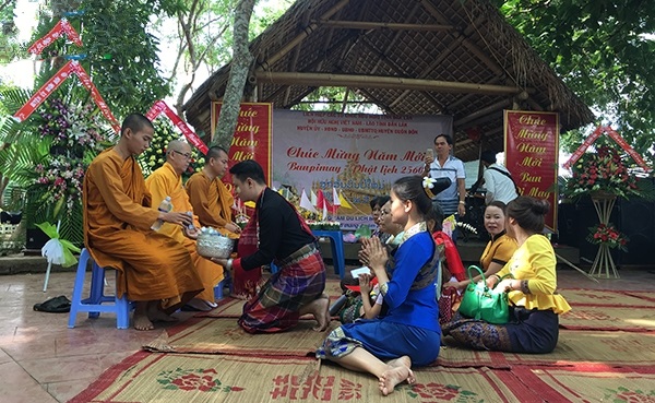 Nghi thức cúng dường chư tăng của người Lào ở Buôn Đôn. Ảnh: Hà Văn Chung