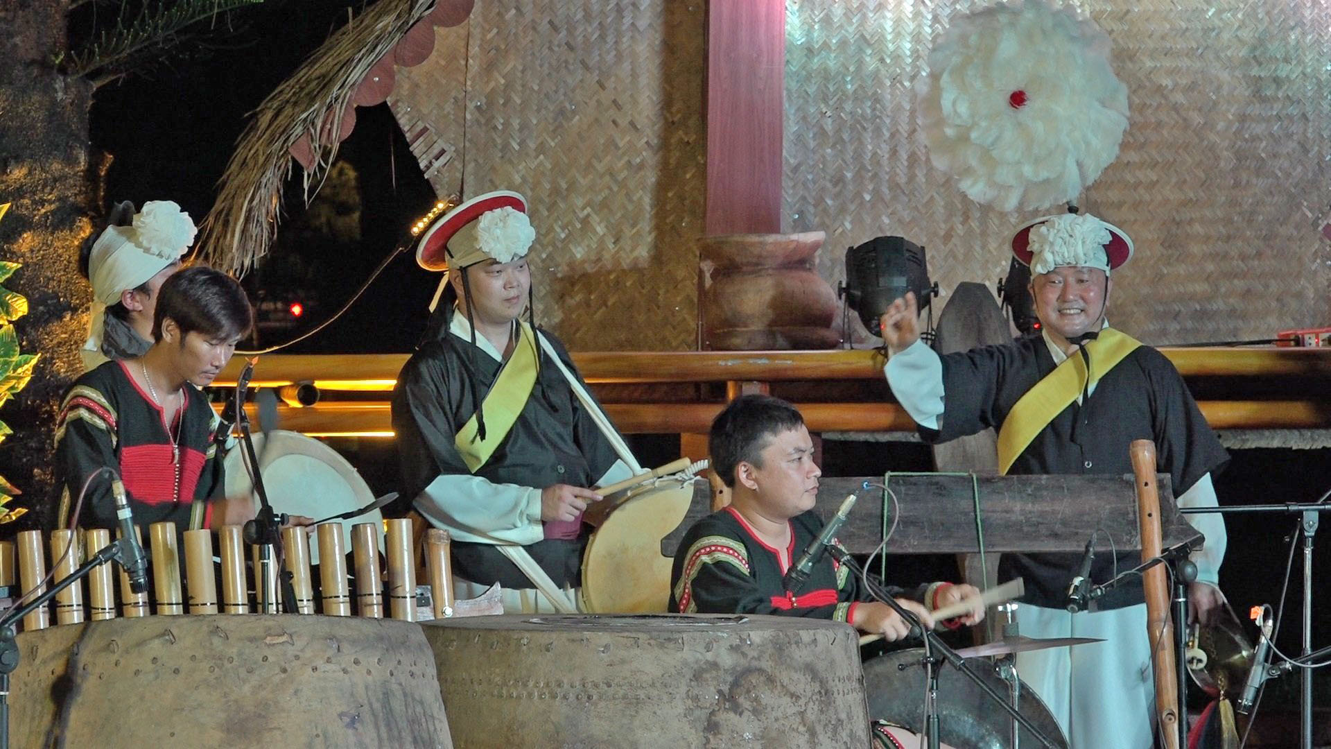 Tiết mục giao lưu giữa nghệ sĩ Hàn Quốc và nghệ sĩ Đoàn Ca múa dân tộc Đắk Lắk tại chương trình biểu diễn cồng chiêng "Vũ khúc hữu nghị".