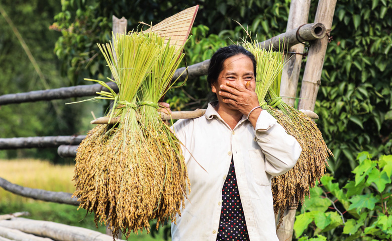 Gánh lúa về. Lúa nếp được bà con cắt phần ngọn, bó túm lại gánh về nhà phơi