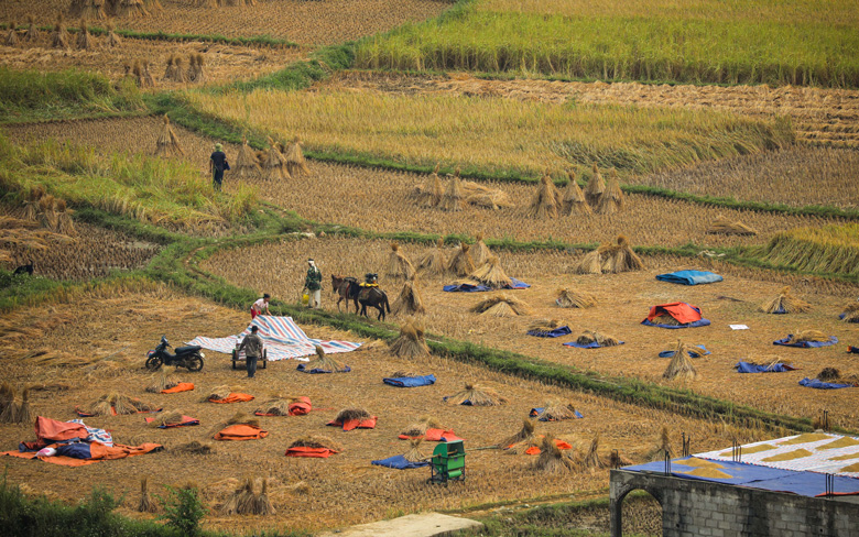 Tôi đến Trùng Khánh đã vào độ cuối mùa thu, lúa đã chín vàng óng trên khắp các thửa ruộng dưới thung sâu. Rất nhiều thửa ruộng, người ta vừa gặt xong, tuốt xong và có thửa vẫn đang gặt dang dở. Xen kẽ với các thửa ruộng nặng trĩu hạt vàng là những thửa ruộng xếp đầy những bó rạ được bà con cột gọn xếp thành từng bó đặt đều đặn như nghệ thuật sắp đặt trên mặt ruộng. Cảnh sắc đồng quê ngày mùa đẹp như trong tranh.