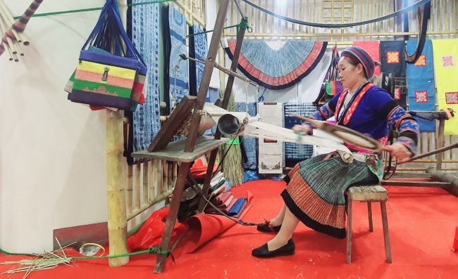 Nghệ nhân dệt thổ cẩm trong khuôn viên Hội chợ (Ảnh: HNV)