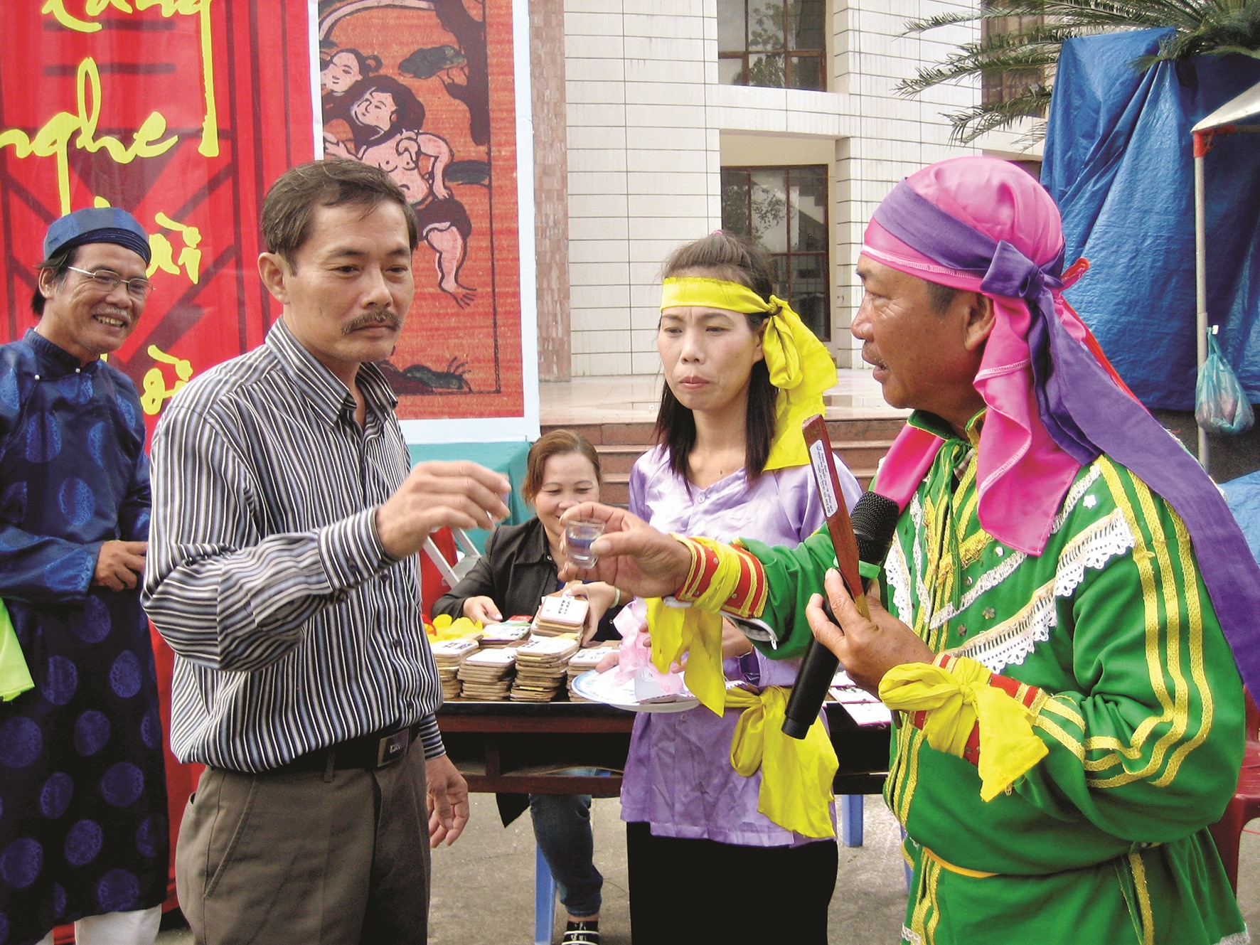 Mời rượu người trúng thưởng. Ảnh: Trần Đăng