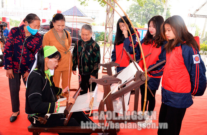 Người dân và các em học sinh trên địa bàn trải nghiệm hoạt động dệt vải của người Nùng tại không gian triển lãm