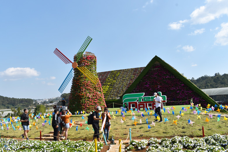 Du khách thích thú chụp hình cùng hoa tại làng hoa Vạn Thành, TP Đà Lạt