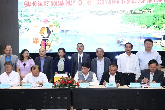 Đại diện Hiệp hội Du lịch Bình Định và UBND các huyện, thị xã, thành phố đã ký kết biên bản về phát triển các sản phẩm OCOP Bình Định. Ảnh: Lê Na