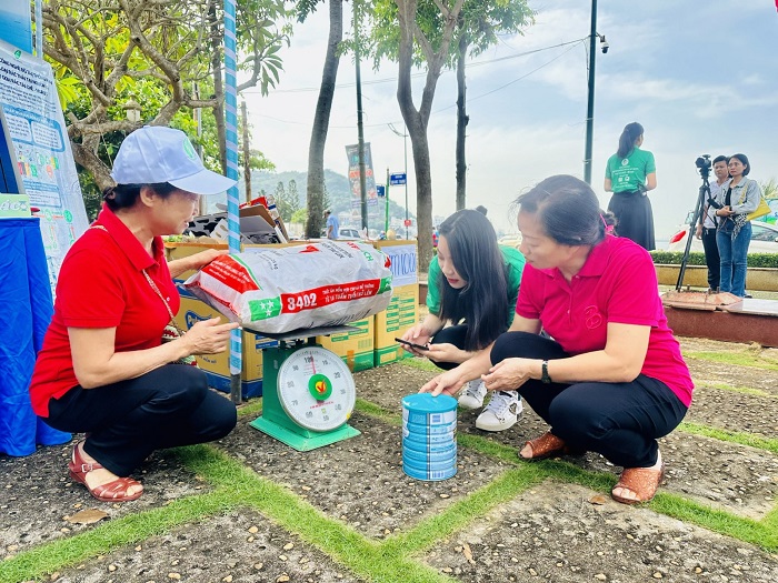 Người dân phường 9, TP. Vũng Tàu mang rác tái chế đến ngày hội đổi lấy quà tặng.