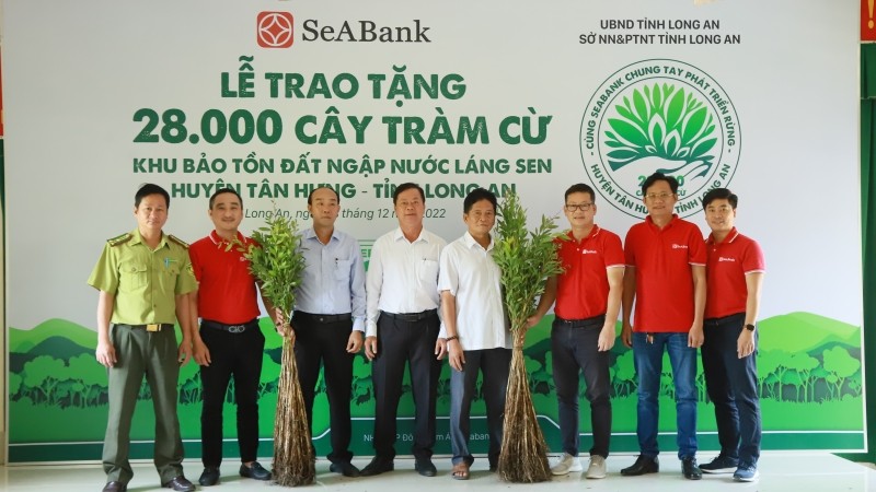 Nhằm hỗ trợ Khu bảo tồn Láng Sen trong việc gia tăng diện tích tràm trồng, bảo tồn tài nguyên đa dạng sinh học đất ngập nước điển hình của địa phương, SeABank đã trao tặng 28.000 cây tràm cừ với tổng trị giá hơn 200 triệu đồng.