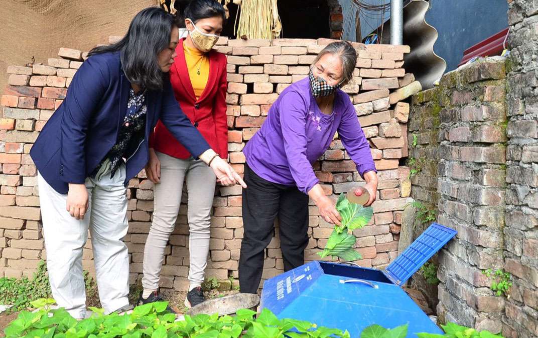 Cán bộ Hội Liên hiệp phụ nữ xã Dục Tú (huyện Đông Anh) hướng dẫn người dân phân loại rác thải sinh hoạt tại nguồn và ủ rác hữu cơ. Ảnh: Đào Huyền