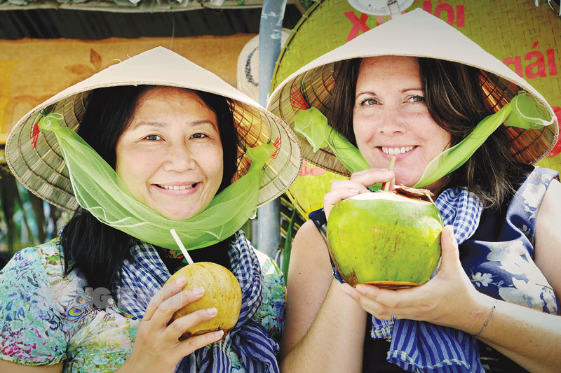 Du khách thưởng thức dừa xanh. Ảnh: Huỳnh Mỹ Thuận