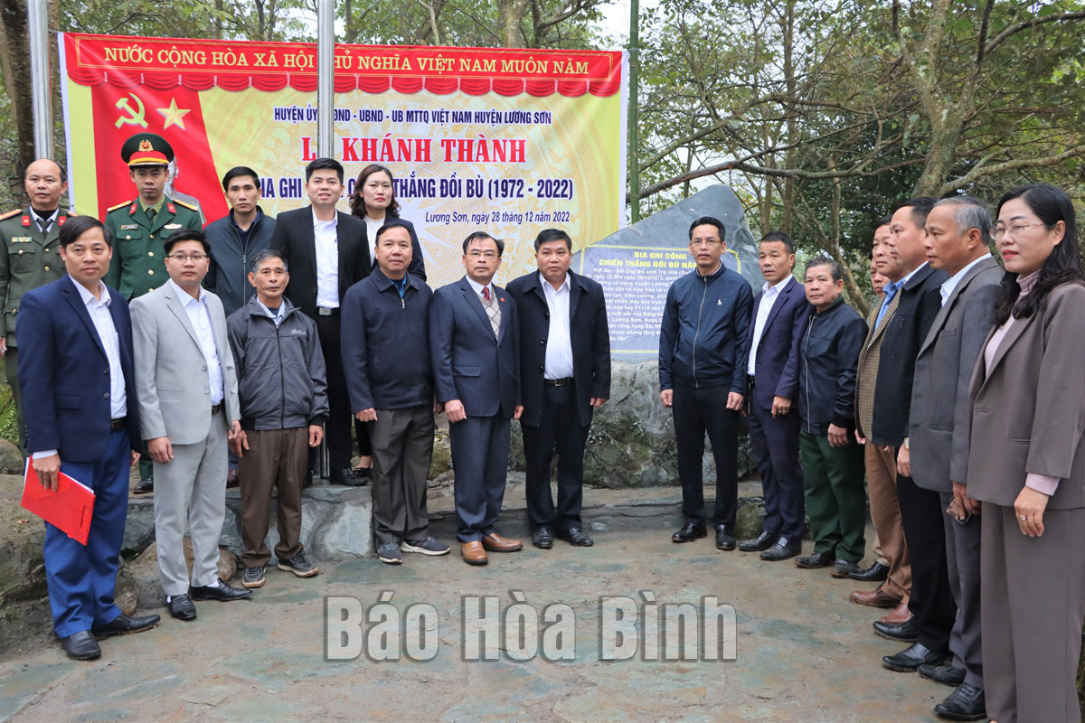 Các đồng chí lãnh đạo huyện cùng các nhân chứng lịch sử bên Bia ghi công chiến thắng Đồi Bù, xã Cao Sơn (Lương Sơn).