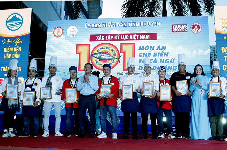 Phó Chủ tịch UBND tỉnh Đào Mỹ và Giám đốc Sở VHTTDL Nguyễn Thị Hồng Thái trao chứng nhận cho các đầu bếp tham gia sự kiện xác lập lỷ lục 101 món ăn từ cá ngừ đại dương Phú Yên. Ảnh: Trần Quới