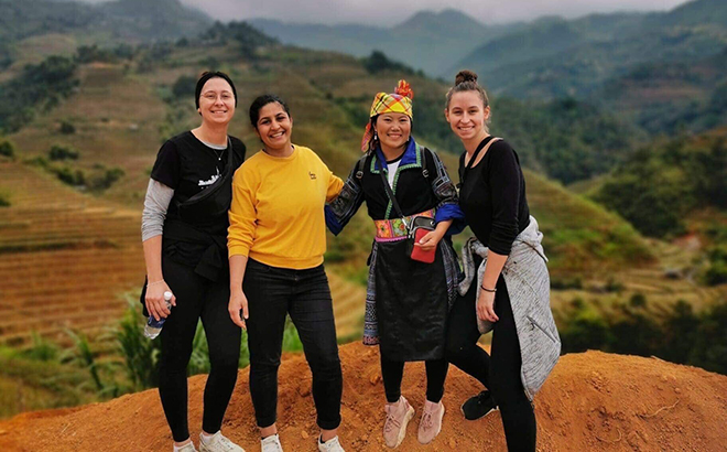 Khách du lịch nước ngoài thích thú khám phá thiên nhiên Mù Cang Chải.