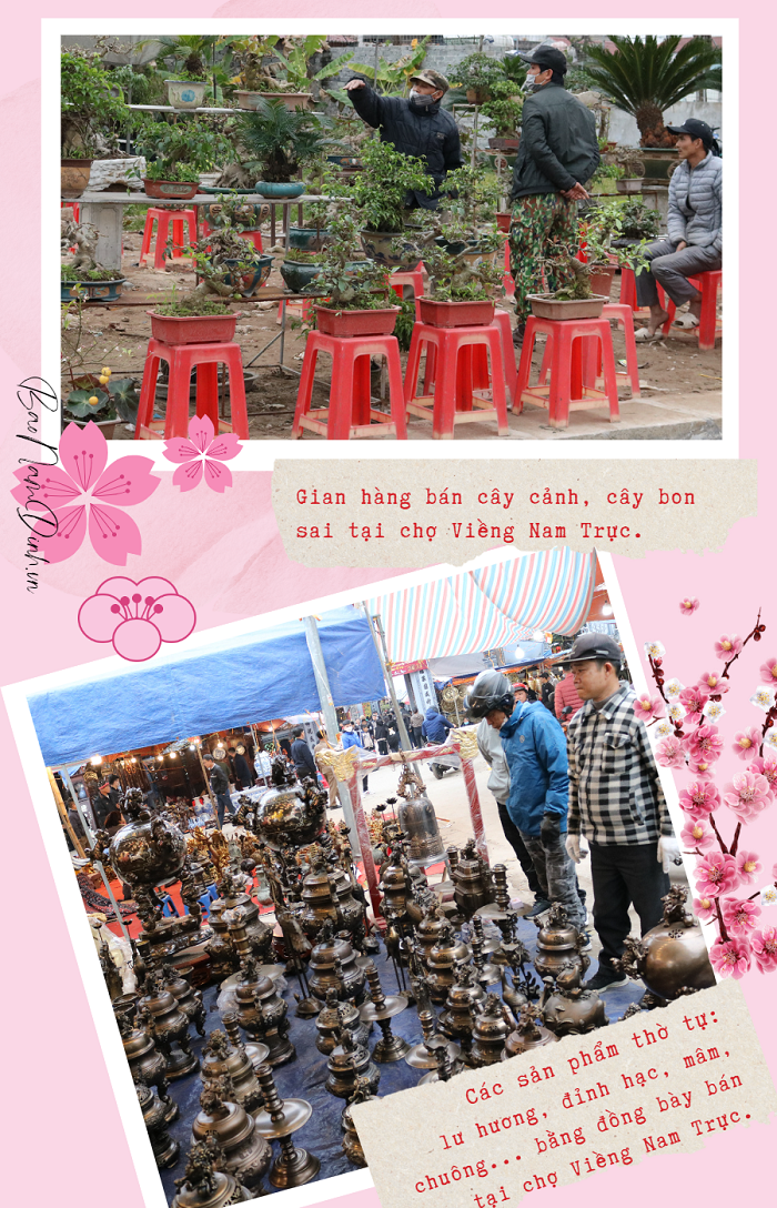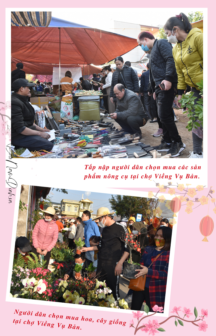 Anh Nguyễn Văn Cương, ở Thái Bình sang bán cây giống ở chợ Viềng Nam Trực cho biết: “Tôi sang Nam Định từ sáng mồng 6 Tết để chuẩn bị cho việc bán hàng. Cây giống chủ yếu là cây ăn quả có chất lượng tốt, sức sống khỏe, được lựa chọn từ những vườn ươm uy tín. Giá cây tùy chủng loại, dao động từ vài chục đến vài trăm nghìn đồng”. Bưng trên tay một chậu địa lan, chị Phạm Thị Thanh, du khách đến từ Ninh Bình cho biết:“Gia đình tôi thường xuyên ra Nam Định đi Chợ Viềng vào mỗi dịp Tết. Cây hoa nhài tôi mua cách đây 3 năm ở chợ Viềng Vụ Bản đến nay vẫn nở nhiều bông rất đẹp. Năm nay, tôi mua thêm chậu lan này về bổ sung cho vườn hoa nhỏ, cũng là “lộc xuân”, lấy may đầu năm”.