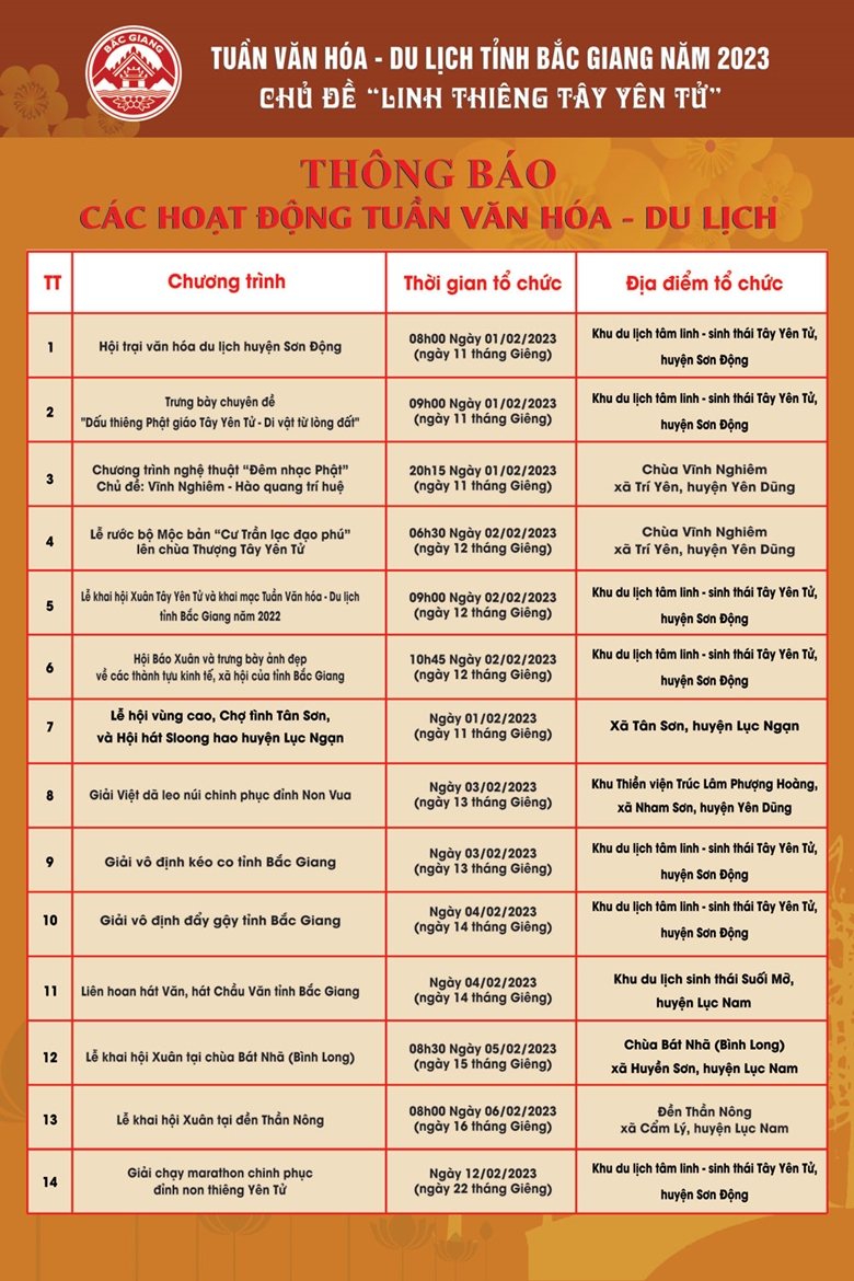 Tuần Văn hóa - Du lịch tỉnh Bắc Giang năm 2023 với chủ đề "Linh thiêng Tây Yên Tử" là sự kiện có ý nghĩa rất lớn nhằm quảng bá các giá trị văn hóa đặc sắc, tạo đà thúc đẩy du lịch Bắc Giang phát triển.