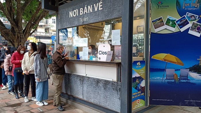 Nhân dân và du khách nghiêm túc xếp hàng mua vé điện tử tại Văn Miếu - Quốc Tử Giám (Ảnh: TITC)