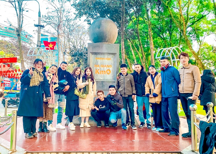 Du khách chụp ảnh lưu niệm tại Cột mốc Km0 (thành phố Hà Giang).