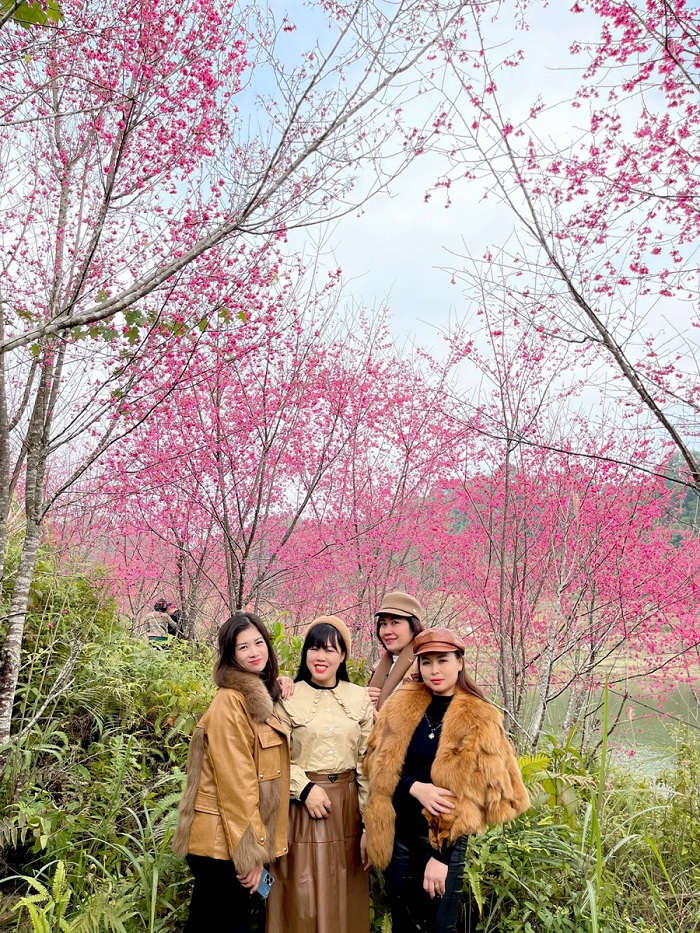 Du khách tạo dáng với hoa anh đào tại hồ Nặm Đăm, xã Quản Bạ. Ảnh: QH