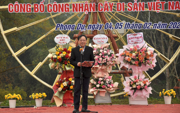 Phó Chủ tịch Hội đồng Cây Di sản Việt Nam Phùng Quang Chính đọc Quyết định Công nhận Cây Di sản. Ảnh: Danh Trường.