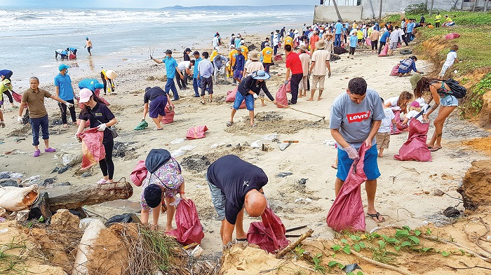 Người dân và du khách dọn rác bờ biển Hàm Tiến. Ảnh: N. Lân.