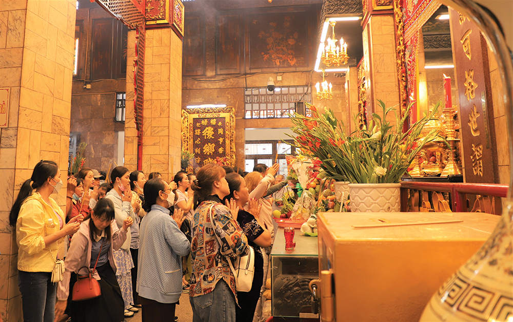 Trên bàn, các mâm heo quay, trái cây, muối, gạo, nhang, đèn… đầy ắp. Nhiều du khách phải đứng chờ đến lượt bày biện mâm lễ vật. Các bình hoa cắm đầy hoa huệ đỏ, huệ trắng, hoa ly ly, hoa cúc, cát tường… Tay cầm ít trái cây cùng vài nhánh hoa huệ trên tay, chị Phan Thị Minh Nguyệt (du khách đến từ TP. Hồ Chí Minh) nói: “Cúng “trả lễ” xong, tôi xin ít hoa quả để lấy lộc mang về nhà cầu mong năm mới mọi điều tốt đẹp, con cái học hành giỏi giang, thi cử đỗ đạt”. Bên cạnh việc cúng tế, nhiều người còn xin lộc để cầu may mắn.