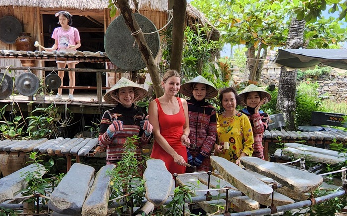 Một du khách nước ngoài thích thú khi tập gõ đàn đá ở không gian văn hóa Hồn Xưa. Ảnh: Quỳnh Mai