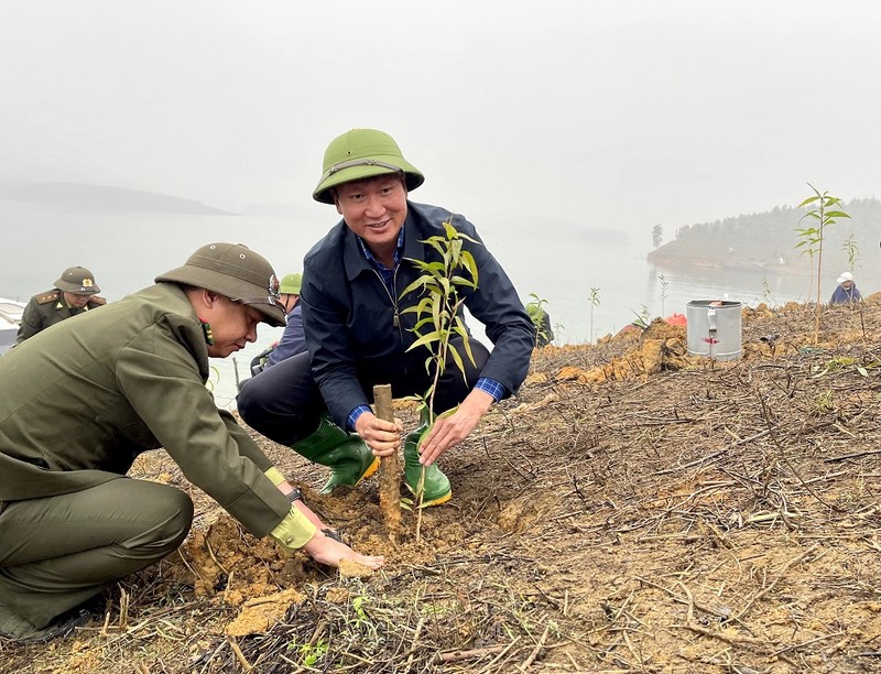 Chủ tịch Ủy ban nhân dân tỉnh Yên Bái Trần Huy Tuấn tham gia trồng cây trên đảo hồ.