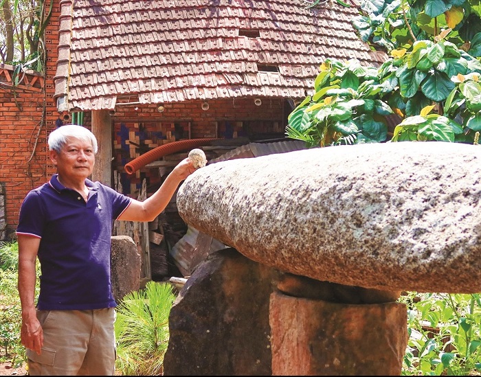 Ông Thành bên chiếc chuông đá phát ra âm thanh kỳ thú.