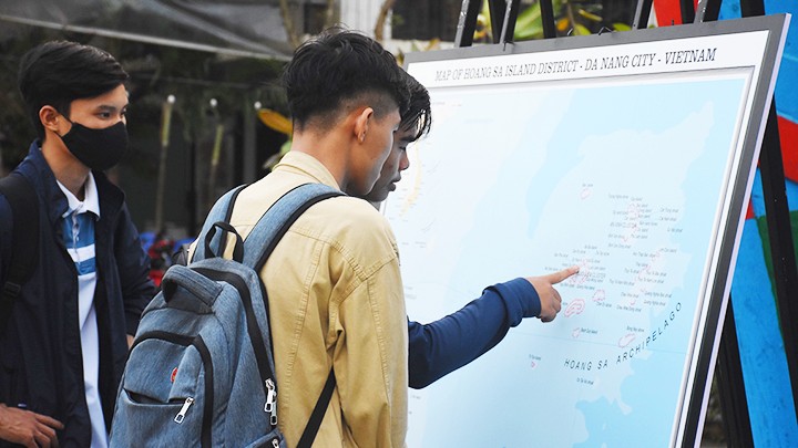 Và lần đầu tiên, hai tấm bản đồ Huyện đảo Hoàng Sa mới nhất bằng tiếng Việt và tiếng Anh của NXB Tài nguyên - Môi trường cùng Bản đồ Việt Nam, được in ấn, trưng bày tại triển lãm. Rất nhiều học sinh, sinh viên Đà Nẵng, đã đứng lặng xúc động trước những tấm bản đồ này.