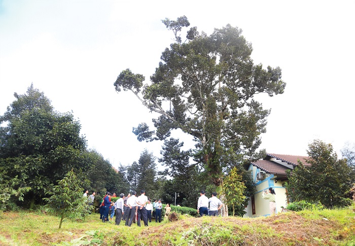 Cây sầu riêng cổ thụ hơn 100 tuổi tại vườn trái cây Nam Nhi cao khoảng 45 m. Ảnh: K.P