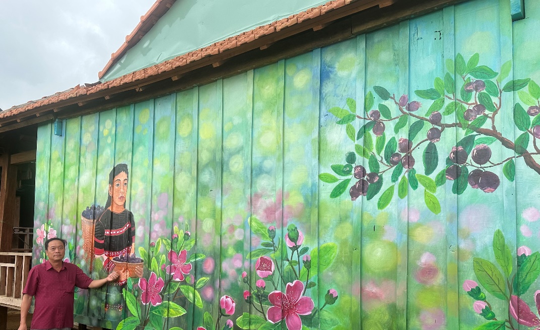 Vừa bước qua cổng làng, tôi đã rất ngạc nhiên bởi những ngôi nhà sàn đầy tranh bích họa. Dù đã gặp nhiều ngôi làng bích họa như làng Cảnh Dương (tỉnh Quảng Bình), làng Mân Thái (TP. Đà Nẵng), làng Tam Thanh (tỉnh Quảng Nam)… nhưng đây là lần đầu tiên tôi thấy một buôn làng dân tộc thiểu số có tranh bích họa khổ lớn vẽ kín mặt tiền những vách nhà sàn.