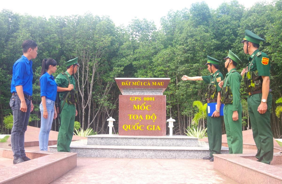 Cán bộ, chiến sĩ Đồn Biên phòng Đất Mũi tuyên truyền, giới thiệu cho đoàn viên, thanh niên tại địa phương về cột mốc tọa độ quốc gia được đặt tại mũi Cà Mau. Ảnh: Lê Khoa