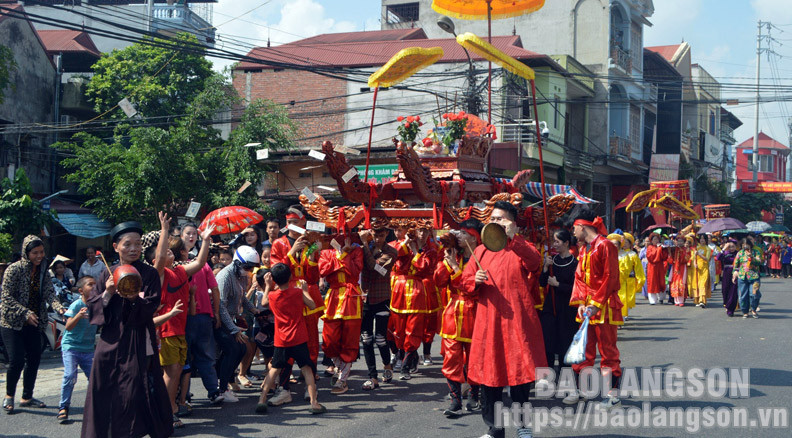Người dân tham gia vào nghi lễ rước kiệu tại Lễ hội đền Trần, thị trấn Thất Khê, huyện Tràng Định, nơi có dòng sông Kỳ Cùng chảy qua