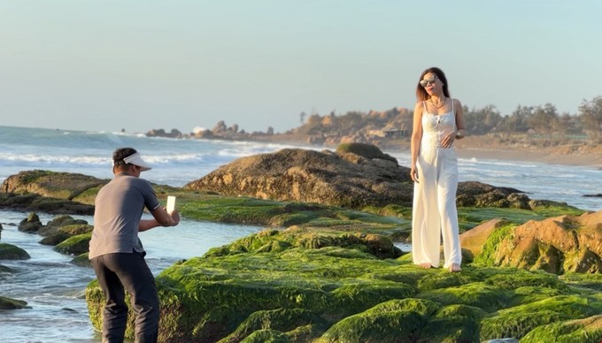 Chị Nguyễn Tuyết Sương, đến từ Đồng Nai chia sẻ, thấy trên mạng xã hội có nhiều bài đăng giới thiệu về bãi rêu nên chị nhờ người quen canh thời điểm rêu đẹp để ra Tuy Phong du lịch. Dù phải thức dậy khá sớm để “săn rêu” nhưng đổi lại, chị được trải nghiệm không gian bình yên ở biển, đón bình minh, ngắm rêu xanh, được tiếp thêm sức cho ngày mới.