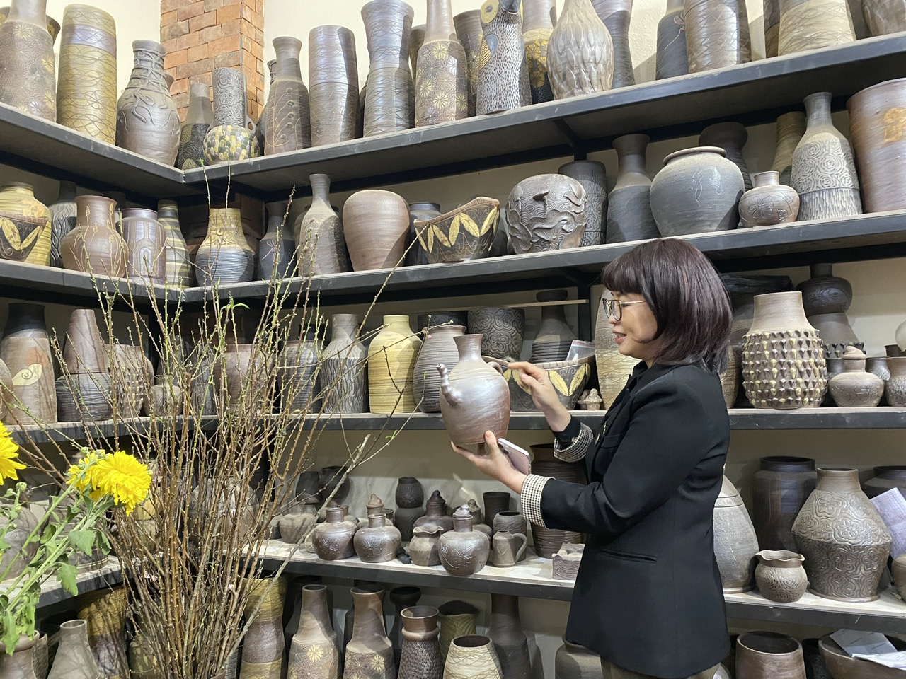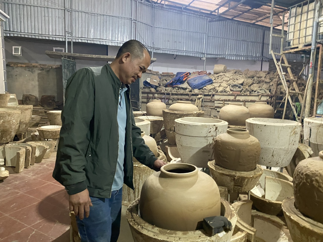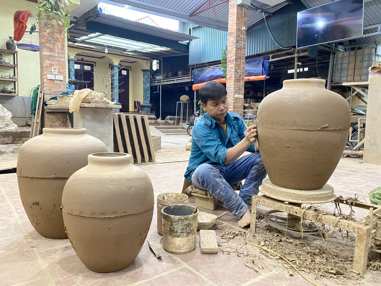 Trong căn nhà cùng khu sản xuất chật hẹp của gia đình anh Tuyến, chúng tôi được chiêm ngưỡng hàng hàng, lớp lớp những chiếc bình, chum đang còn dở dang và đang hoàn thiện. Tôi nhớ lại lời chị Phạm Thị Thu Huyền, Trưởng Phòng Văn hóa và Thông tin huyện Bình Xuyên có nói với tôi trước khi tôi về làng nghề, rằng - "cũng do không có đủ diện tích đất, nhà nào nhà nấy làm nghề phải kết hợp vừa sinh hoạt, vừa sản xuất và trưng bày chứ không được phân chia riêng như ở làng nghề Bát Tràng. Để phát triển du lịch làng nghề quả là còn nhiều khó khăn".