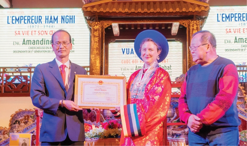 Trao tặng bằng khen của Chủ tịch UBND tỉnh cho TS. Amandine Dabat (Quốc tịch Pháp) - hậu duệ đời thứ 5 của vua Hàm Nghi