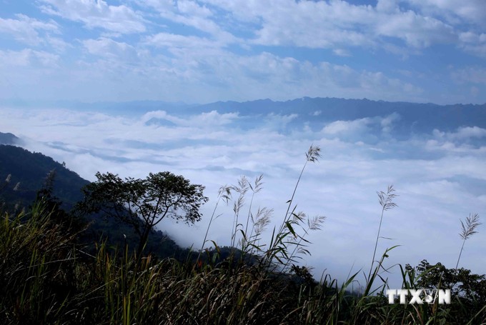 Biển mây lững lờ trôi đan xen những ngọn núi trùng trùng, điệp điệp hút tầm mắt. Ảnh: Quý Trung - TTXVN