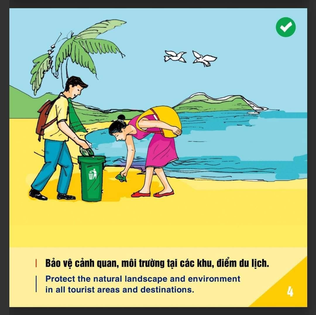 Một số nội dung trong bộ quy tắc như: Tuân thủ pháp luật Việt Nam; thực hiện đúng nội quy, quy định tại các khu, điểm đến; tôn trọng sự khác biệt về văn hóa và cộng đồng địa phương, giữ gìn bản sắc văn hóa dân tộc; bảo vệ cảnh quan, môi trường tại các khu, điểm du lịch; giúp đỡ, ưu tiên người lớn tuổi, người khuyết tật, trẻ em và phụ nữ mang thai; giữ gìn an ninh trật tự nơi công cộng; lấy thức ăn, đồ uống vừa đủ dùng;...