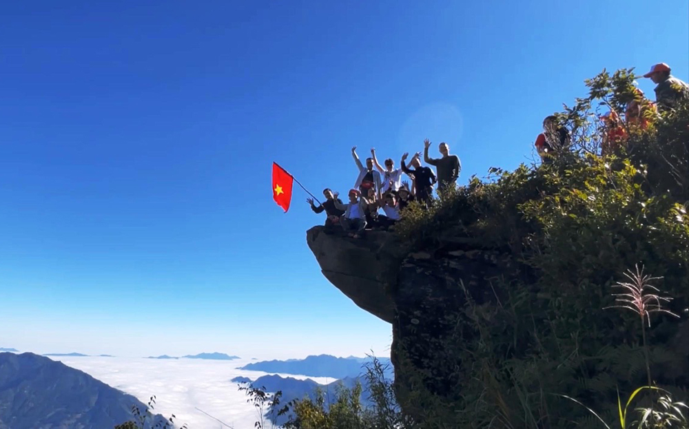Du khách săn mây, chụp ảnh ở mỏm đá đầu rùa trên đỉnh núi Tà Xùa, xã Bản Công, huyện Trạm Tấu.