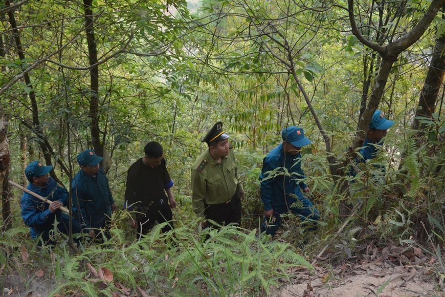 Cán bộ Hạt kiểm lâm Mù Cang Chải phối hợp với UBND xã Mồ Dề tuần tra rừng.