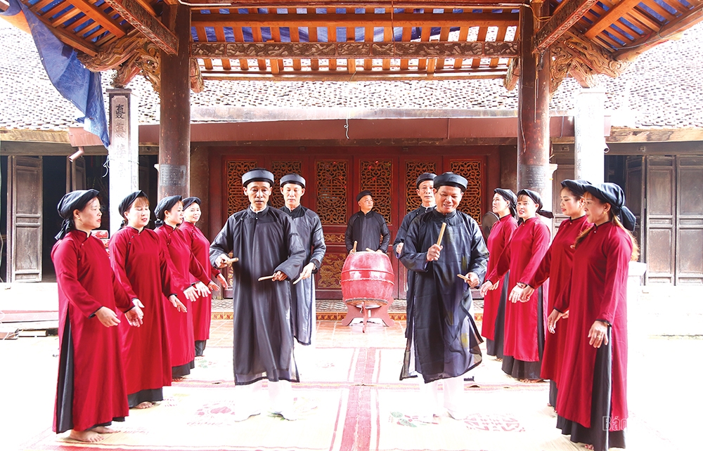 Các nghệ nhân biểu diễn Hát Xoan tại Đình Hùng Lô.