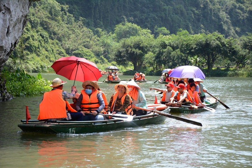 Du khách đi đò thưởng ngoạn danh thắng Tràng An.