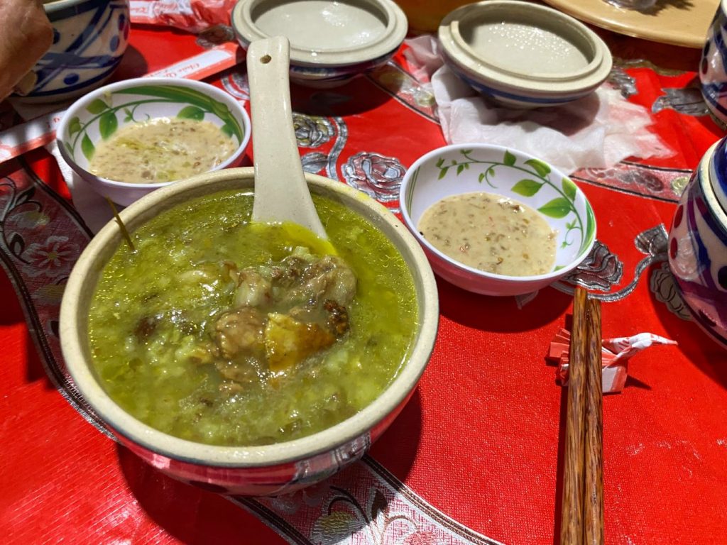 Món cháo cối và nước chấm thấm đặc trưng của người dân xã Hiệp Phước.
