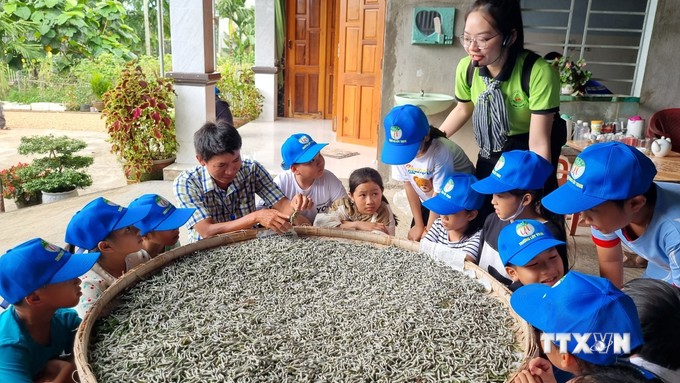 Học sinh trải nghiệm cách nuôi tằm tại huyện Nghĩa Hành (Quảng Ngãi). Ảnh: TTXVN