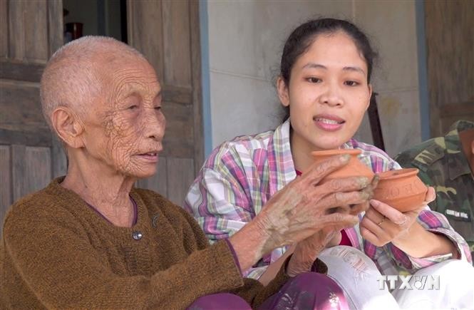 Giới thiệu cách làm gốm cổ Sa Huỳnh cho du khách. Ảnh: TTXVN