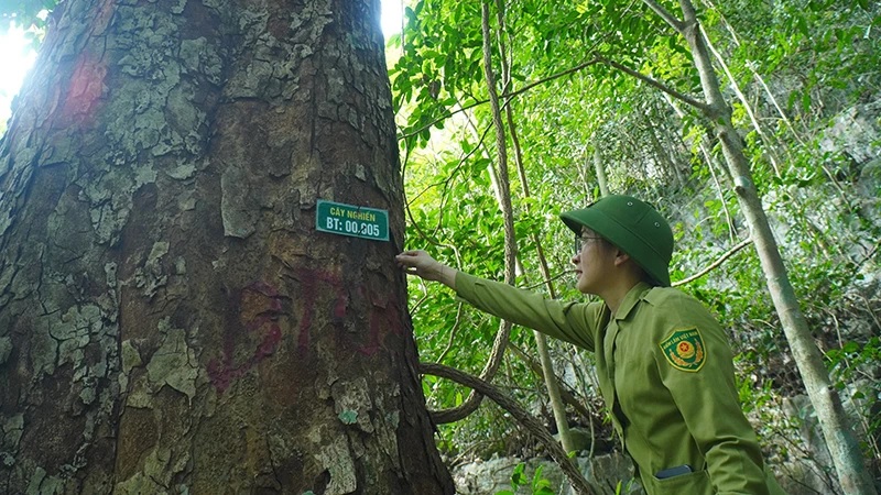 Sau một tiếng đi bộ, xuyên qua rìa núi đá, chúng tôi đã đến vùng lõi, những cây nghiến khổng lồ ngày càng nhiều hơn. Đứng trước một cây nghiến cổ thụ, nữ kiểm lâm viên Nông Thị Thuận giới thiệu, trong khu bảo tồn có khoảng 2.000 cây nghiến lớn, đã được đánh số cẩn thận từng cây một.